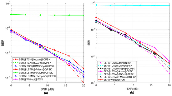 To test the performance of the proposed TCN, we have compared the BER and SER with the time-series LSTM model as well as the without TCN model. The calculation of the BER and SER at the receiver side is as follows: (1) the error rate of the BER describes the incorrect demodulated bit at the receiver and (2) the incorrect categorization of the received symbol means the error rate for the SER. Thus, in the simulation results, the BER and SER of the BPSK are different for the proposed system. In addition, the simulation results of the BER and SER for the BPSK and QPSK are taken over the AWGN. In this study, the application of the TCN is the pilot project for testing the RIS-based environment and further investigation is needed for the performance improvement. In the future, the TCN model will be tuned with proper parameters for obtaining a more optimal performance. Figure 6 shows the BER and SER performance of the proposed TCN model with consideration of the QPSK modulation. Figure 6a,b show the performance comparison with the proposed TCN, LSTM model, and without TCN model in terms of the BER and SER results. The results are performed by comparison of the three optimizers, Adam, SGDm, and RMSprop. From Figure 6a, it is shown that the performance of the BER with the Adam optimizer achieves better results compared to the two others. Next, the RMSprop optimizer as compared to the SGDm optimizer achieves a good BER. The overall error trend of the SER follows the BER trend which is shown in Figure 6b. It is shown that the Adam optimizer provides a better SER performance compared to RMSprop and SGDm. Again, it is shown from Figure 6b that RMSprop has a better performance than SDGm. From Figure 6 and Figure 7, it is observed that the proposed TCN model outperforms the LSTM and without TCN model in terms of the SER and BER simulation results with different optimization algorithms. In addition, it is noticeable that, with SGDm optimization, the LSTM model performance is very poor compared to the proposed TCN with the same simulation parameters.