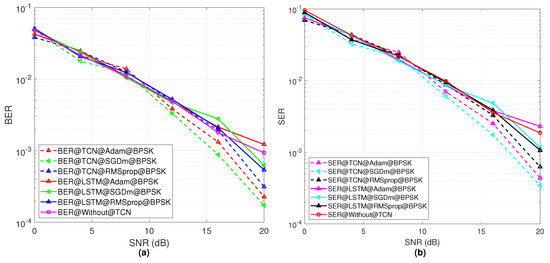 On the other hand, Figure 7 represents the performance of the BER and SER of the proposed TCN model with consideration of the BPSK modulation. Figure 7a,b show the performance comparison with the proposed TCN, LSTM model, and without TCN model in terms of the BER and SER results. In this case, it is shown from Figure 7a that SGDm has a better performance as compared to the Adam and RMSprop optimizers. When fewer constellation points in the modulation scheme are used, SGDm can decode the received bits successfully. After that, Adam has the second highest BER performance and SGDm gives the worst performance in the case of the BER. Figure 7b shows the SER performance of the three optimizers, and a similar trend is shown like the BER results. In addition, compared with the LSTM and without TCN method, the proposed TCN-based model provides a better performance in terms of different SNR values.