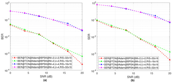 (a) The BER results of the proposed TCN model effectiveness for different system configurations, (b) SER results of the proposed TCN model effectiveness for different system configurations.
