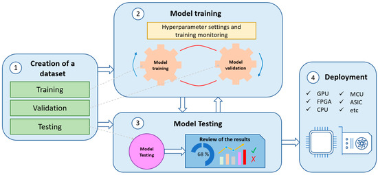 DL consists of four phases: (a) the creation of a dataset (if there is no open-access dataset available), which allows for characterizing the problem to be solved, and therefore, obtaining accurate results; (b) training, where the input data are used to calculate the model parameters; (c) the evaluation phase, where the trained model gives a value to different input samples and the algorithm is evaluated; and (d) the deployment and execution of the model for a specific application, e.g., on a microcontroller or a Graphics Processing Unit (GPU). Figure 1 shows the described workflow for DL.
