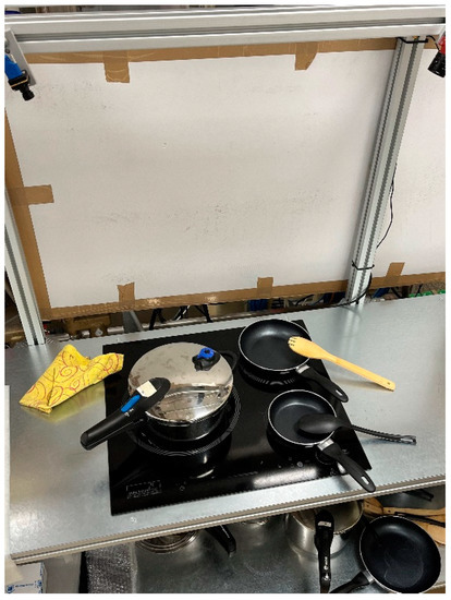 On the one hand, the images used to train the object detection algorithm have been obtained using an Allied Vision camera placed in a functional model of a real kitchen. The cooking environment can be seen in Figure 5. A Python program has been used to capture the images with the help of Allied Vision’s Vimba Python API [32].