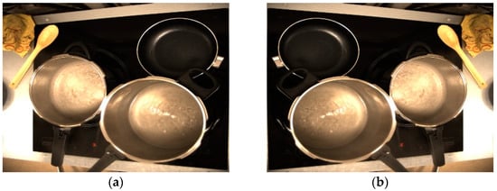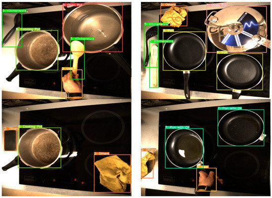 The training data used in this work are images of everyday objects in a real cooking environment. The total number of images corresponding to the main dataset is more than 7500, and all are in JPG format. The images have been manually labelled and provide relevant information about the application environment and the situations to identify. In total, eight objects/situations that perfectly characterize a cooking environment have been classified: pots with lids, pots without lids, pots without lids and water boiling, pans without oil, pans with oil, kitchenware, users, and others (other types of objects that can be found in the kitchen, such as cleaning rags, mobile phones, etc.). Some examples of the objects to detect can be seen in Figure 3. These objects will be enough to implement an algorithm that can act on the cooktop depending on what is detected.