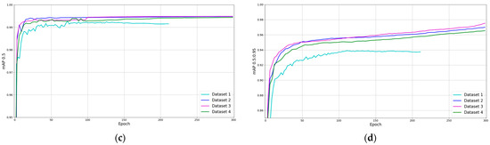 To evaluate the performance of the models with the developed dataset, the precision (P), recall (R), and average precision (AP) were calculated and compared. The metrics were calculated with the help of the following equations. The precision is the ratio of the number of true positives to the total number of positive predictions. The recall measures how well the model can find true positives out of all the predictions. The AP defines the proportion of the correct detections to the sum of the correct detections and false detections of objects, and the mAP is the average identification accuracy of all the classes.