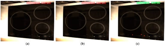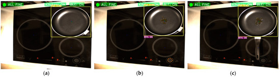After the connection of the computer to the cooktop, the detection of objects and the consequent identification of situations of interest begins. Firstly, when the pot has no cover, the algorithm will be able to determine if there is water boiling in it. If cooking water is detected, a command will be sent to the cooker to reduce the power of the corresponding heater. Figure 11 shows the boiling water identification sequence. In Figure 11a, water is cooked on one of the rings. When it is detected that the water is already boiling, a command is sent to the cooker to reduce the power, as in Figure 11b. Once this command is accepted, the power of the heater is reduced, as shown in Figure 11c.