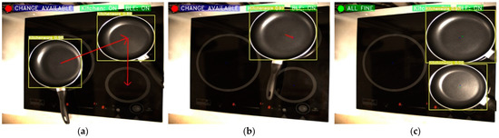 In Figure 13, it can be seen how the burner recommendation algorithm works. In Figure 13a, for example, all the objects could be better placed, so the user is recommended to move them to the best spots. In Figure 13b, it is noted that the object is in the correct heater but not properly centered. Finally, in Figure 13c, the frying pans are correctly placed.