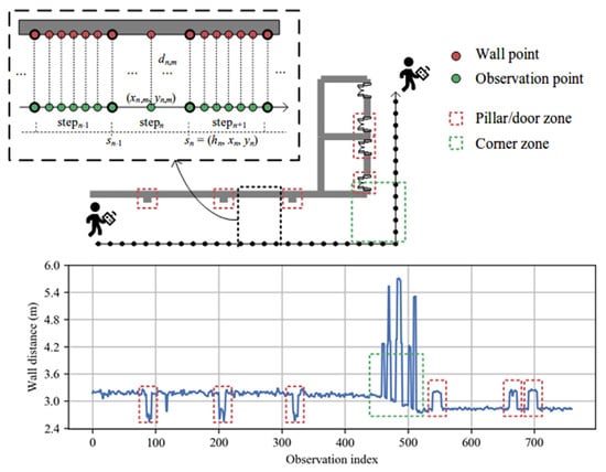 Problem description. The user trajectory is represented by a sequence of pedestrian poses. Each pose is denoted as a tuple with the heading orientation and the step coordinate. The wall distance between adjacent steps establishes the positional relationship between pedestrian pose and the surrounding walls. Each wall distance links an observation point on the trajectory and a wall point on the wall surface. The wall distance observations suffer from large fluctuations due to corner and barrier (e.g., pillar or door) zones on the wall.
