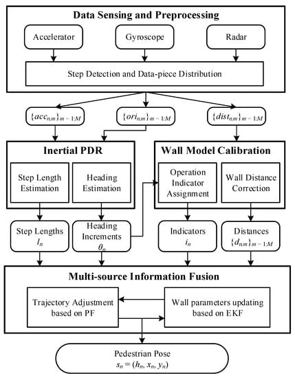 Figure 3 presents the system diagram of our RadarPDR scheme, which consists of four main modules: (i) data sensing and preprocessing; (ii) inertial PDR, (iii) wall model calibration; (iv) multi-source information fusion.