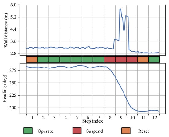 Illustration of the operation indicator assignment strategy. The plots show wall distance observations (above) and heading orientations (below) of several steps around a corner in a typical trajectory. Suspend is assigned to corner steps where heading increment threshold . Reset is assigned to the beginning steps of each non-corner segment. Other steps are indicated as Operate state.