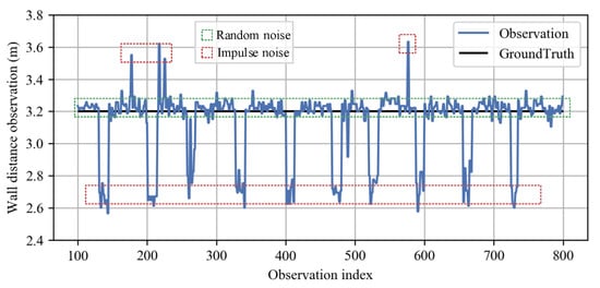 Firstly, we discuss the random noise, which can be approximated to Gaussian white noise. To simplify the description, we assume the number of single-step observations and simplify the notation of the single observation at the n-th step to . The general situation () will be explained later. Let and denote the change rate of and the process noise. Let and denote the wall distance observation and the random noise following a Gaussian distribution with zero mean and variance, respectively. The random noise can be corrected by a Kalman filter (KF) with the following state-space model: