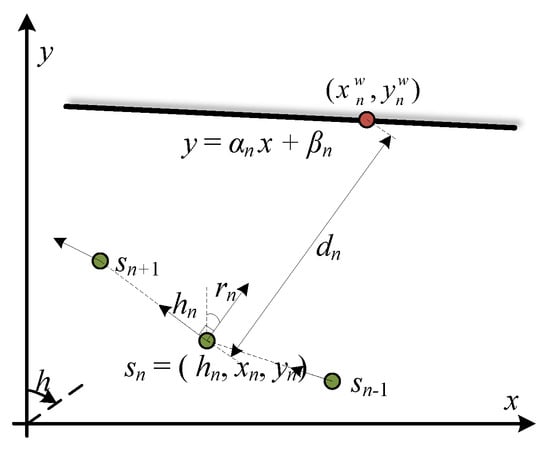 As shown in Figure 7, given the pedestrian pose , the ranging direction and the wall distance , the wall point is represented as