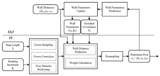 In the PF part, wall parameters must ensure pedestrian poses, while this is the exact opposite in the EKF part. Consequently, these two parts are concatenated to boost each other, as illustrated in Figure 8. At the iteration of n-step, the step length, heading increment, wall distance observations from previous modules and wall parameters, and residual covariance from the EKF are fed to the PF, which outputs pedestrian pose estimation after the three procedures of new particles’ sampling, weighting, and resampling. Then, the pose estimated by PF and wall distance observations are fed into the EKF, which outputs updated wall parameters. The complete trajectory adjustment algorithm is summarized in Algorithm 2.