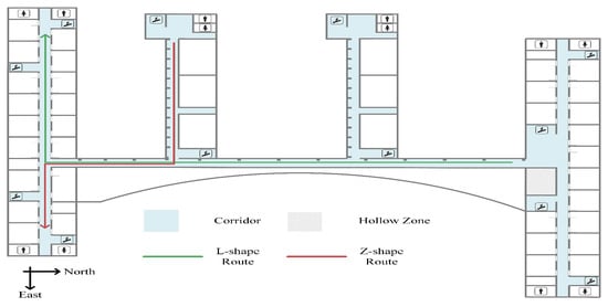 As shown in Figure 1, we adopted a supporting stand to fix the D2G module on a smartphone, keeping a constant 90 angle between heading and ranging direction. The experiments were conducted on the fifth floor of a classroom building at our university. We designed two different routes, as shown in Figure 9, to experiment our scheme. The L-shape and Z-shape route are combinations of straight lines and right angles, and their lengths are 192 m and 136.8 m, respectively. A student holding the device repeats each route 20 times.