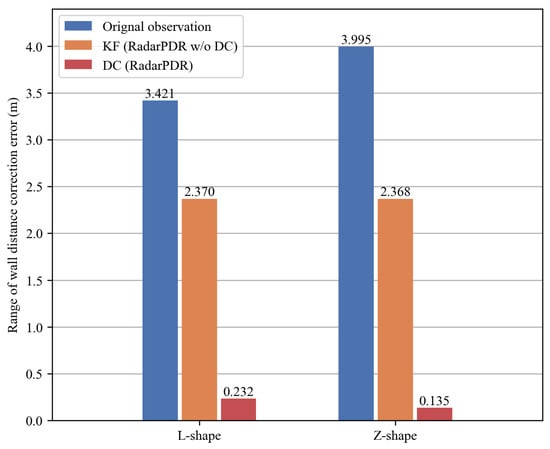 In order to test the effectiveness of the wall distance correction module, we apply two different algorithms to correct wall distance observations on 20 trajectories of each route, including DC in RadarPDR and KF in RadarPDR w/o DC. Specifically, DC is the completed method summarized in Algorithm 1 while KF is the standard Kalman filter given by Equations (1)–(3) without the proposed outlier correction stage. Their parameters are set as: process noise variance , observation noise variance , wall distance change rate limit , and smoothing factor . For KF, the process noise variance is the same as DC, and the observation noise variance , which compensates for its weakness in handling outliers.