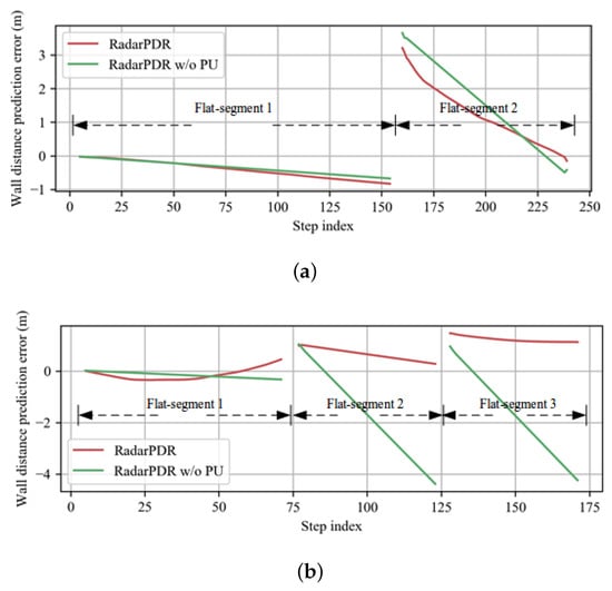 To demonstrate the effectiveness of the wall parameter estimation module, we compare the parameter estimation results of the RadarPDR and RadarPDR w/o PU scheme. The RadarPDR has an initialization phase and an updating phase, whose parameters are set as: the number of initialization steps , the process noise of wall estimation , and the observation noise . The RadarPDR w/o PU has only the initialization phase with the same parameter setting as RadarPDR. Since the range of wall parameter variables is infinite, the estimation error is not workable as an evaluation criterion here. We define the wall distance prediction error (WDPE) to evaluate the estimation performance by