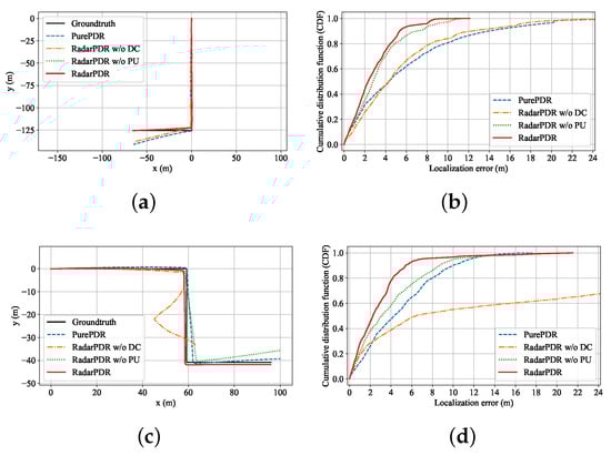 Figure 12 plots the adjusted trajectory results and their corresponding CDFs for L-shape and Z-shape routes. Compared with the PurePDR scheme, the RadarPDR w/o DC produces a comparable average localization error (ALE) in the L-shape route and even performs much worse in the Z-shape trajectory, which can be attributed to the large wall distance error deactivating the trajectory adjustment procedure. This observation also verifies the importance of the DC module. On the other hand, the RadarPDR w/o PU can achieve smaller ALE on both the L-shape and Z-shape routes. Moreover, the complete RadarPDR has the best trajectory adjustment performance, reducing its ALE by 48.1% in the L-shape route and 41.1% in the Z-shape route. It is also worth mentioning that the PurePDR overtakes the RadarPDR at the point (13.5 m, 0.98) in Figure 12d, resulting from one failed trajectory adjustment in the 20 tests on the Z-shape route. Combined with the analysis of WDPE in the previous section, this failure should be attributed to large initial wall parameter error, which makes the EKF estimation process divergent and leads to the wrong trajectory correction direction.