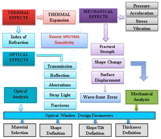 Derivation of the optical protective window requirements and definition of the protective window key design requirements should be carried out after an integrated multidisciplinary analysis [18,19,20] which has been adapted to the anticipated multi-sensor’s real application environment. While the influencing effects (as shown in Figure 3) are numerous, for most applications, some of these influences may be neglected and simplified analysis can be performed.