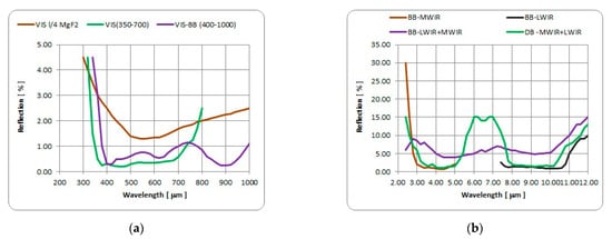 In IR imaging systems, temperature can cause some additional effects. A window’s high temperature can cause elevated background temperature, thereby increasing the noise level in the image sensor. In addition, non-uniformly heated window material causes complicated optical and mechanical effects at the same time [41,42,43]. Most IR optical materials exhibit a strong index of refraction temperature dependence which can affect the AR coating’s effectivity. IR material emissivity [44,45] can have high value, causing a higher level of background radiation. Low reflection AR coatings have low emissivity, helping to resolve this issue.