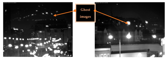 In visible light systems, double-reflection ghosts are caused by double-reflection ghost of the sunlight or other dominant illumination source. In an infrared system, a cryogenically cooled detector, having low radiance, acts somewhat like sunlight but generates a dark (low temperature) area in the image. This effect is called the narcissus phenomenon [37,38] and happens due to cold signal being retro-reflected from the lens surface. Actually, this effect is a kind of stray radiation in the IR imager. IR stray light can be minimized using proper design solutions [39]. In addition to image degradation, unwanted IR stray radiation causes changes in background radiation [40] which degrade thermal contrast and increase image noise level. The most effective measure against this is to keep reflection as low as possible on both window surfaces. This goal is not completely achievable because DLC coating, whilst providing high surface durability, has increased reflection.