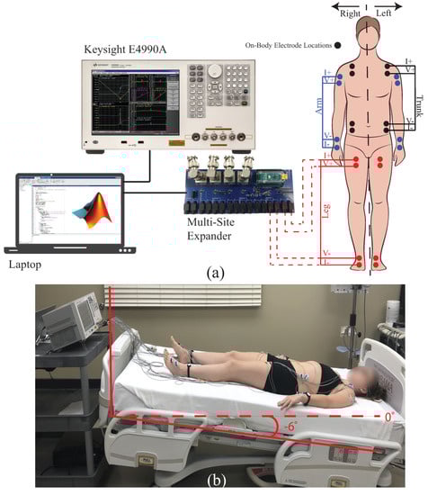 (a) Experimental configuration to collect 6 segmental resistance (right/leg arms, trunk, and legs) using Keysight E4990A with multi-site interface expander and (b) sample setup of participant during 6° HDT.