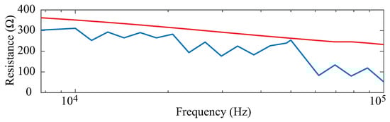 The collected resistance data were processed in MATLAB to assess quality and limit datasets with artifacts (e.g., data that was not representative of the tissue) from potential equipment errors or measurement conditions from affecting processing and interpretation. The resistance data from all participants at each time point were visually inspected to identify potential artifacts. An example resistance dataset that was collected from the left leg of a participant with suspected artifacts is shown in Figure 2 as a blue line. The left leg resistance in Figure 2 does not show a consistent trend of decreasing resistance with increasing frequency that is expected for tissue measurements. For comparison, a dataset that does follow the expected is shown in Figure 2 as a red line. This dataset is the right leg resistance of the same participant measured at the same time point. The visually jagged trend of the left leg data could be a result of muscle contractions/movement during measurement of this body segment. Kitchin and Freeborn previously reported increases in resistance up to 6.75 Ω increase in a stepped-sine bioimpedance measurement (also utilized in this work) from contraction during their measurement of the biceps tissues []. The observed alterations of the left leg resistance in Figure 2 are similar to those reported for a contraction event and were not observed in the consecutive measurements before or after this time point. This supports that this specific measurement was not representative of the tissue and was labeled an artifact. Participants with artifacts in one or more of their collected datasets were removed from further analysis. Based on this, the exclusion criteria data from 8 of the 12 participants were included for analysis.