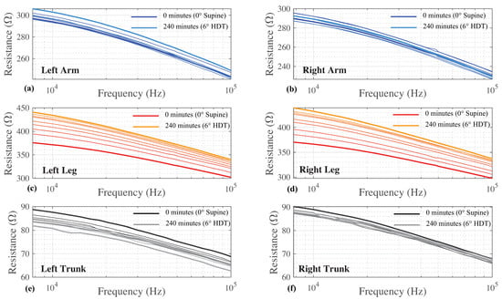 Segmental tissue resistance (from 7 to 100 kHz) of (a) left arm, (b) right arm, (c) left leg, (d) right leg, (e) left trunk, and (f) right trunk of a single study participant collected at 30 min intervals while the participant was in the HDT position. The darkest and lightest lines indicate the first and last measurements, respectively, through this protocol.