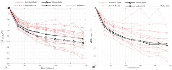 where is the relative difference, is the resistance at min, and is the resistance at time point x, where min. The calculated relative differences for the participants are given in Figure 4a,b for the 10 kHz and 100 kHz resistances, respectively, as red lines. For reference, the median values (previously reported in Table 2 and Table 3) are also shown as solid black lines for both the left and right segments.