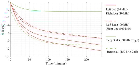 Comparison of the relative 10 and 100 kHz left and right resistance changes from study participants compared to the 150 kHz relative difference between the thigh and calf by Berg et al. [].