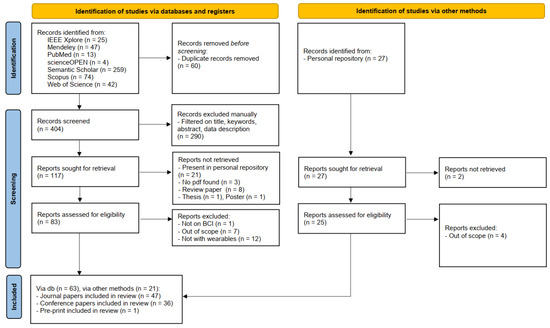 by analyzing the results obtained through the extensive search initially performed considering different EEG, MI, and BCI related keyword combinations (Section 2.3) detailed in Table 2 and the final paper pool identified through the PRISMA flow (Figure 1).RQ1: Is there a significant amount of EEG-based MI-BCI studies using wearable technologies in the literature that implies a promising future development of this research field, especially in uncontrolled environments and outside the medical and clinical settings?