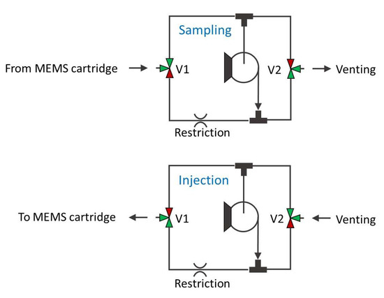 The cartridge was filled with Carbograph 240 m2/g, which is suitable for capturing highly volatile species. The efficiency of a purge and trap thermal pre-concentration cycle depends on a number of variables and varies with different analytes, sorbent material type, and mass. In particular, the sorbent needs to be optimized for the target analytes, with highly volatile gases requiring stronger sorbents than low-volatile or high-boiling vapors. The main characteristic figure of a sorbent material is the breakthrough volume, indicating the volume of carrier gas necessary to purge a specific analyte through 1 g of sorbent at a specific temperature. Ideally, if the best sorbent is chosen for a specific analyte and kept at a suitable low temperature to avoid reaching the breakthrough volume, the theoretical pre-concentration coefficient is the ratio between the sampled volume and the volume of the carrier gas used for complete analyte desorption. In reality, the main limitation of the MEMS pre-concentrator used in this work is the small amount of sorbent, typically around 40 mg, resulting in a rather low breakthrough volume and thus lowering the effective pre-concentration coefficient. In a previous work, the pre-concentration effect for different target compounds was compared, using similar MEMS devices coupled to a GC/IMS for detection [19]. In any case, the use of the proposed LIRAS system is the detection and identification of specific target gases at low concentrations, and not their quantitative measurement, therefore the exact determination of pre-concentration coefficient and linearity for the different target gases is beyond the scope of this work. Figure 3 shows the fluidic schematic circuit implemented in the sampling pump module during the sampling phase and injection phase.