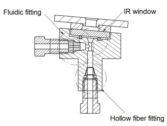 A hollow optical fiber acted as the absorption cell of the sensor, since it allows both the radiation from the IR source and the vapors desorbed by the VPC to pass through. An opto-fluidic cell of miniaturized internal volume was purposely developed to interface the hollow fiber with the MEMS IR source through an infrared window, and with the fluidic outlet of the VPC by means of a VICI Valco 1/16” nut, as shown in Figure 4.