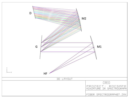 Bearing in mind the requirement of implementation onboard UAVs, the Czerny–Turner configuration was adopted for pursuing the compactness of the IR spectrograph. Moreover, in order to reduce costs and time for development, the selection of optics was driven by market availability of commercial off-the-shelf (COTS) components. The specifications of selected COTS components were used in the simulation of the optical system using the Zemax optical design program. Figure 5 reports the 3D layout of the simulated optical system, where the exit aperture of the hollow fiber coincides with the entrance aperture of the spectrometer.