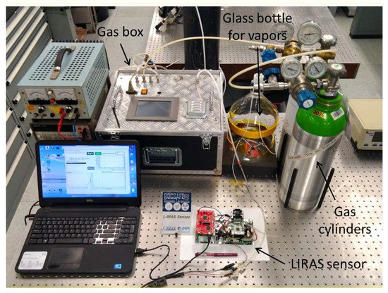 Figure 7 shows a picture of the test bench set up to carry out several tests with real compounds at different concentration levels. For testing with gases, different standard pressurized gas cylinders were utilized. The first one contained a reference mix of ammonia (NH3) at the concentration of 1000 ppm (parts per million) in nitrogen, the second one contained a reference mix of sulfur hexafluoride (SF6) at the concentration of 1000 ppm in nitrogen, and the third one was filled with pure nitrogen. They were connected to a gas box equipped with mass flow controllers and switching valves allowing the production of controlled mixes at diluted concentrations to investigate the response of the sensor and evaluate its limit of detection (LoD) for compounds of interest in security applications. Ammonia was at the top of the list of hazardous chemicals provided by the International Task Force-25 [10]. Sulfur hexafluoride is a safe simulant of volatile nerve agents [21]. For testing with safe vapors of liquid compounds at room temperature, glass bottles containing liquid VOC standards, in particular ethanol (CAS# 64-17-5) and isopropanol (CAS# 67-63-0) were procured from Carlo Erba Reagents, Cornaredo, Italy, and small amounts of liquid were evaporated into a 5.5-L glass bottle to produce controlled vapor concentration assuming total evaporation.