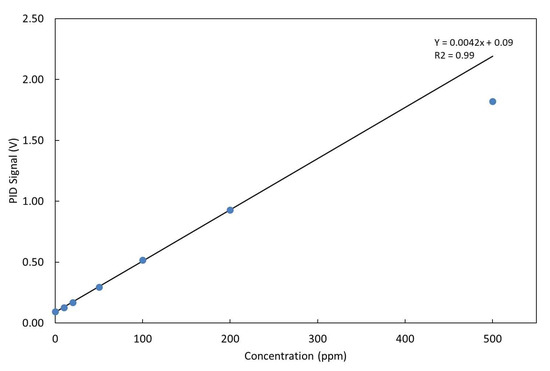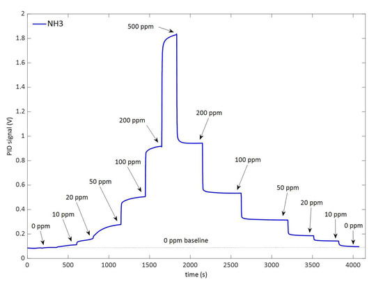 The LIRAS sensor was managed by means of the GUI running on a notebook and was alternately connected to the gas box or to the glass bottle to carry out tests with gases or vapors, respectively. All tests for validation of the LIRAS sensor have been carried out according to the following procedure: the sensor was kept indoors on the test bench and connected to an external power supply unit set at 24 V (HP model E3631A), and to a notebook running the sensor GUI through USB connection, as depicted in Figure 7. In tests with gases, one reference gas cylinder and the nitrogen gas cylinder were connected to the gas box on different inlets. The gas box outlet was directed to the sensor sampling probe, which was a simple Teflon tube, without sealing to avoid overpressure towards the sensor inlet. The mass flow controller and the switching valves of the gas box were set to produce the mix at the desired concentration for the test. Whatever the gas mix, the output flow of the gas box was always set higher (200 mL/min) than the sampling flow of the sensor (100 mL/min), in order to avoid additional dilution of the sampled mix. If considering liquid VOCs, a small amount of liquid (microliters) was injected into the 5.5-L glass bottle depicted in Figure 7. After waiting for a few minutes, to allow almost complete evaporation of the liquid, the bottle was connected by Teflon tubing to the sensor to start sampling. Once the gas/vapor mix was ready for testing, the operator started the sampling and analysis procedure via the GUI of the sensor, and the results were shown in real time on the notebook screen and recorded on file. Figure 8 shows the response over time of the PID in concentration monitoring mode while the sensor was sampling different concentrations of ammonia generated by means of the gas box. Figure 9 shows the same results plotted as a function of the concentration. A detection capability down to 10 ppm and a linear response at least up to 200 ppm were obtained. In this range of linear response, a sensitivity of about 4.2 mV/ppm was evaluated from acquired data. If assuming a conservative 0.5 mV noise level of the PID signal, a LoD of about 100 ppb was estimated. It is useful to point out that the photoionization efficiency of ammonia at 10.6 eV is rather low, thus the ppb detection limit of the mini-PID is not applicable for this molecule, nevertheless this LoD for ammonia is well suited for security applications, because it is well below the safety level of the ERPG-1 [22] limit for ammonia of 25 ppm. The ERPG-1 limit is defined in the Emergency Response Planning Guidelines as the most restrictive limit to avoid adverse health effects from exposure to certain airborne chemical concentrations.
