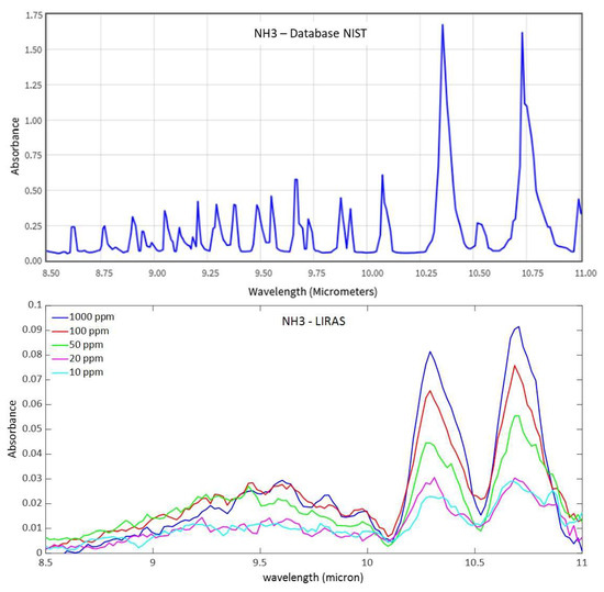 Despite the sufficient sensitivity demonstrated to detect ammonia, the PID is intrinsically sensitive to many other molecules (e.g., all the gas molecules that can be ionized by the PID’s lamp, including non-hazardous species) and cannot also be used to identify the presence of a specific hazardous molecule. The miniaturized infrared analyzer of the LIRAS sensor allowed us to overcome this limitation. Within the working spectral range of the analyzer, the LIRAS sensor measures the IR absorption spectrum of the sampled molecule and makes a comparison with a reference database for identification. In Figure 10, a spectrum of ammonia from the NIST reference database of IR spectra [23] and the spectra measured by the LIRAS sensor at different concentrations of ammonia above the detection limit of the PID are shown.
