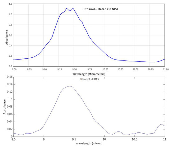 Comparison between the reference IR absorption spectrum of ethanol from the NIST database and the spectrum measured by the LIRAS sensor.