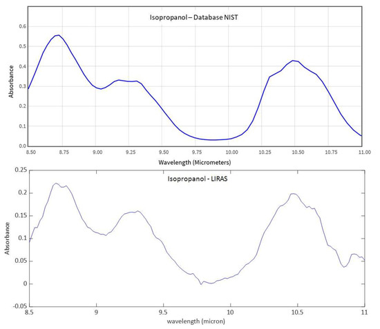 IR comparison between the reference IR absorption spectrum of isopropanol from the NIST database and the spectrum measured by the LIRAS sensor.