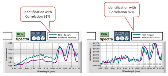 Some LIRAS reference spectra of ammonia were acquired and stored in the sensor experimental database to improve the identification capability. Then, several tests were carried out with ammonia at descending concentrations, and the correlations between measured and reference spectra were computed for each test. Figure 14 shows two screenshots of the LIRAS sensor’s GUI developed for ROCSAFE with the results obtained at the concentrations of 35 ppm and 12 ppm, where the spectrum of ammonia was identified with a correlation of 0.91 and 0.81, respectively.