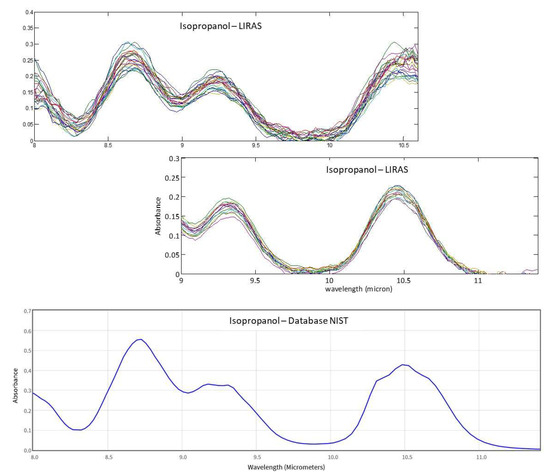 Moreover, the possibility to change the spectral range of the LIRAS sensor was demonstrated by slightly rotating the grating, so as to capture different spectral intervals on the LDA. This allows adaptation of the working spectral range of the LIRAS to acquire the absorption bands of different target molecules of interest in different applications. Compatibly with the transmittance range allowed by the window of the LDA, an extended working spectral range from 8 μm to 11.4 μm was validated, by comparing the measured spectra with the reference spectra of the NIST database. Figure 15 shows, as an example, several spectra of isopropanol acquired in the spectral ranges 8–10.6 μm and 9–11.4 μm. They are compared with the NIST reference spectrum of isopropanol to demonstrate the correspondence in the whole spectral range of 8–11.4 μm.