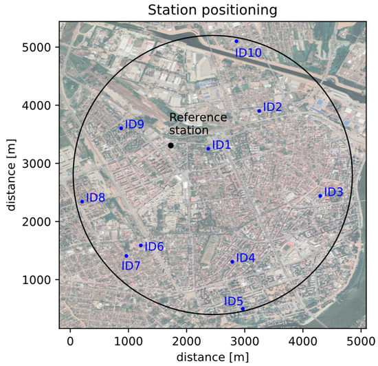 After the initial collocation period, during which the initial calibration was performed using linear regression, the sensors were placed in real conditions, with a distance from the reference station ranging from 0.7 to 3 km of the reference station, with the spatial arrangement shown in Figure 1.