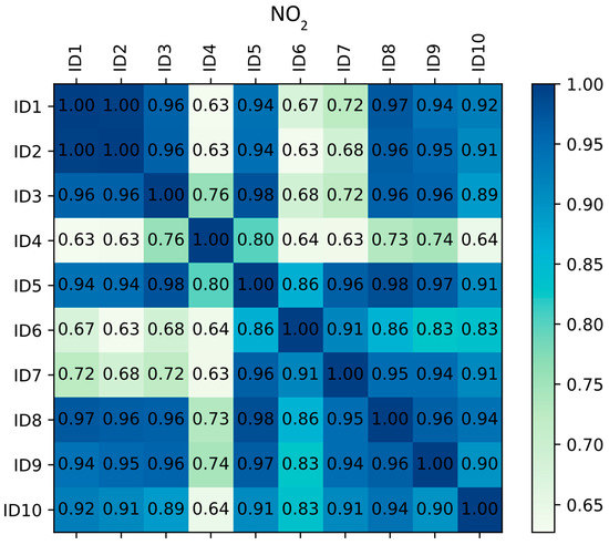 The agreement between the measuring devices for NO2 can be considered high, with the lowest correlation coefficient being 0.63. It is interesting to note, however, that the variation between measurement agreement does exist and that certain devices had a nearly perfect correlation (e.g., ID9 and ID10), while others do correlate, but to a lower degree. This indicates that to create a perfect correspondence between two low-cost sensors or a low-cost sensor and reference measurement for NO2, and non-linear correction would be necessary.