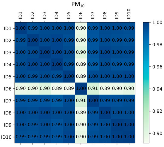 A slightly different situation can be observed for PM10 measurements as compared to NO2. Although there were variations in the correlation, all stations except ID6 had a correlation coefficient of 0.99 or higher, which indicates a very high degree of conformity. Furthermore, the ID6 station, although it had the lowest correlation coefficients with other stations, still reached values of 0.89, which indicated a high degree of agreement. The agreement between relative humidity and temperature measurements of low-cost devices and the reference device was sufficiently high, which indicated good usability of the weather estimation capabilities of the low-cost devices without any need for corrections.