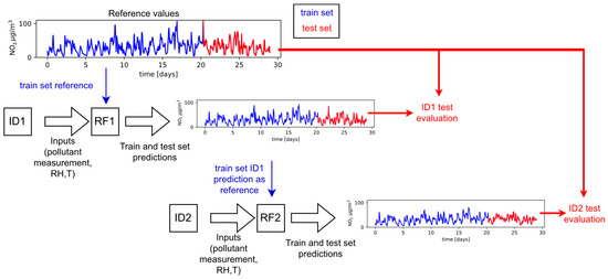 Within the calibration propagation in direction 1, the algorithm RF1, which corresponds to station ID1, was first trained. This algorithm took low-cost measurements of the specific pollutant as input data, relative humidity and temperature, and it took the values of the observed pollutant measured from the reference measuring station as output data. Through the training process, the algorithm changed its parameters and “learned” to predict the output values based on the input values. In the next step of calibration propagation, the algorithm RF2 corresponding to station ID2 was trained, with the fact that the reference measurements were not taken from the reference measuring station but from station ID1 after calibration (output of algorithm RF1). This process continued until all low-cost stations were calibrated. The steps for calibration propagation performed for a single month for NO2, are illustrated for devices ID1 and ID2 in Figure 4.