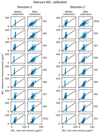 The results shown in Table 2 indicate a clear improvement in the NO2 calibration propagation for both directions and for both the correlation coefficient and the RMSE. On the other hand, there is quite a prominent variability between the measurement improvements between the stations. The direction of calibration is also shown to influence the improvement of parameters, indicating that the order in which the calibration transfer is performed can indeed influence the results for individual stations, but the overall improvement was still present. The visual presentation of the calibrated data given in Figure 5 also illustrates the improvements quite well. Notably, the device ID1, ID2, ID4 and ID5 had quite a narrow output of values prior to the calibration, but is shown to have considerably improved for both directions of the calibration propagation.