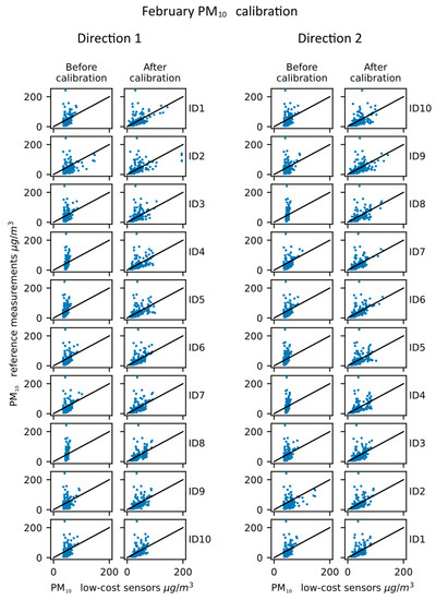 The results presented in Table 6 show that on average, the increase of for NO2 was 34.2% and 58.6% for the two observed months, indicating a clear improvement, especially in May. The reduction of RMSE was not as prominent in terms of percentages as the for NO2, but it is still present. For PM10, the improvements in terms of metric percentages are reversed. The value has an improvement for both months, but it is smaller than NO2. The decrease of the average PM10 RMSE value is comparable to the NO2 decrease in February, but in May the decrease of the RMSE value was quite substantial (67.4%). Considering the deterioration that can occur in low-cost sensors, a benefit for both electrochemical (NO2) and optical (PM10) sensor can be obtained, as shown by the data displayed in Table 6.