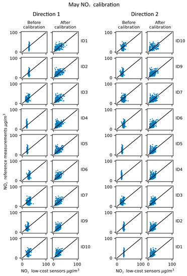 The NO2 measurements in May show overall similar trends to the ones from February, with a couple of slight differences. The RMSE improvements are not always consistent, with the negative values indicating an increase in the parameter. The correlation of the sensors is, on the other hand, improved for all sensors except for sensor ID1 in direction 2. The output ranges of ID1, ID2, ID4 and ID5 are still quite narrow, and despite varying improvements in the metrics, it can be observed in the figure that their output range was widened. The lack of improvement of correlation of ID1, for direction 2, can also be observed in Figure 7, especially when comparing the results with the ones from direction 1.