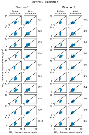 The results of the PM10 calibration in May show several differences in comparison to the February results. First, the correlation improvement is not present for all devices, with devices ID1, ID5 and ID8 having a decrease in the value for both directions. The values of the PM10 are also much lower than they were in February, with the maximum values being around 80 in May, while the maximum values of PM10 in February were around 200 . This is to be expected as PM10 emissions are higher in colder months due to the heating season. This could also be the reason for the differences in correlation performance. On the other hand, clear offsets for all sensors can be seen visually on the uncalibrated data in Figure 8., and the offsets are considerably improved after calibration, which is shown both in the RMSE parameter and on the visual presentation. The cause of this offset before the calibration propagation is probably the deterioration of sensors, as the PM10 sensors tend to have increased particle residue over time. The sensors measure the dispersion of laser light, which is caused by the particles, so the gathered particle residue could cause more laser dispersion and, therefore, an overestimation of values.