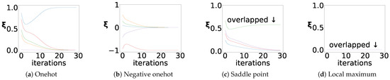 SNN’s convergence to stationary points. Curves with different colors represent different order parameters. In the figure, (a,b) converge to the target stable point, and the positive or negative one-hot, i.e., one-order parameter converges to , while others converge to 0; (c) converges to the saddle point that stems from multiple identical extreme values in ; (d) converges to the local maximum point that stems from the zero-vector initialization of . Note that this chart is only for representation. The divide-by-0 error terminates the iteration in the update formula.