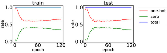 The averaged percentage of train and test set subcodes reaching one-hot or zero vectors. The total percentage rises to nearly 1 at the early stage of the training.