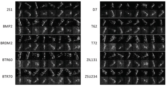 We designed experiments using SAR images of 10 different military carriers from the MSTAR dataset [29]. The carriers included 2S1, BMP2, BRDM2, BTR60, BTR70, D7, T62, T72, ZIL131, and ZSU234. X-band SAR generates these images with a resolution of 0.3 m × 0.3 m. The images acquired from 17° and 15° were used as the training and test sets, respectively, and there were 2747 and 2426 samples with a near-uniform distribution; details are shown in Table 1. Since the images of different classes varied in size, although the pivotal features were located in the center of the image, we normalized all image sizes to 256 × 256 and used the 64 × 64 pixels in the center as the network input. To minimize the differences in data distribution between the training and test sets, we applied affine transformations to train samples, including random rotation (−15°,15°) and random shear (−15°,15°) in the horizontal and vertical directions. The batch size was 256.
