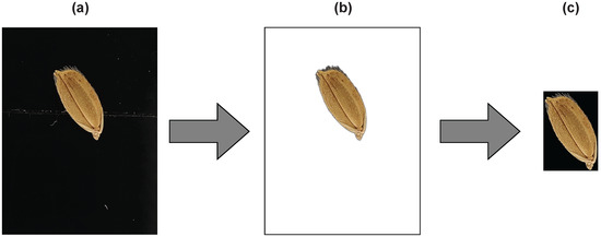 Image preprocessing steps. (a) The images were captured using a smartphone camera. (b) The backgrounds were removed from the raw dataset. (c) Seeds were cropped and isolated.